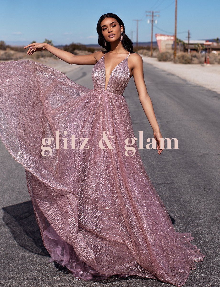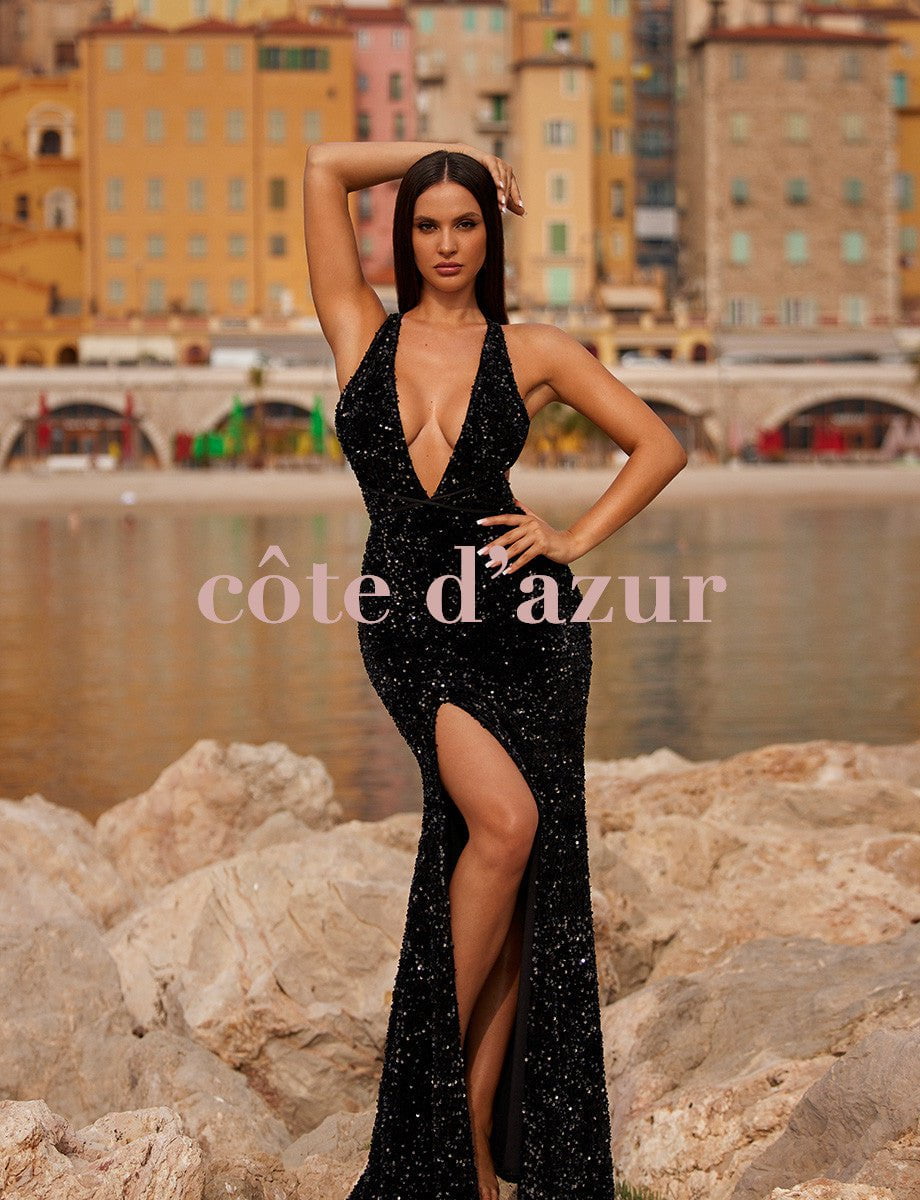 The Sofia Gown is made from a luxurious lace and is double lined. This glamorous gown features two waist high slits that sit under the waist, a v neckline, low back and a flare skirt. This fabric has minimal stretch and an exposed back zipper.